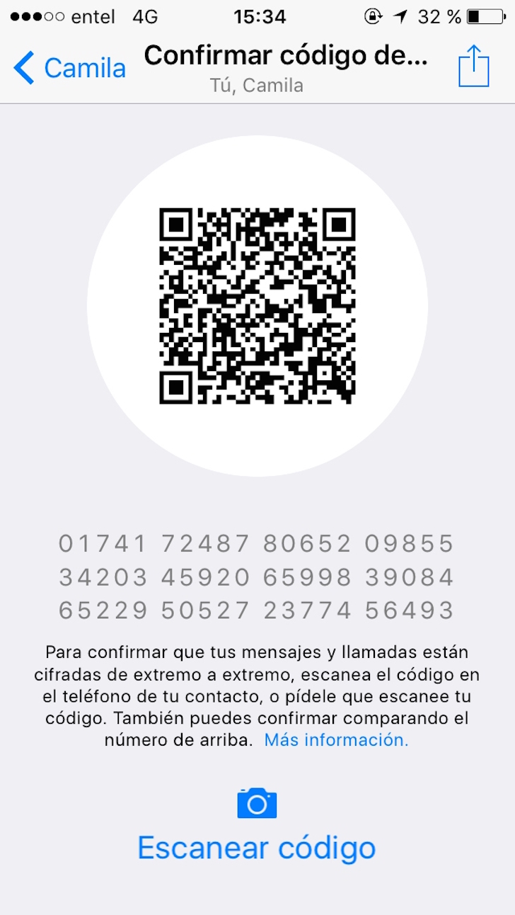 A partir de ahora, cada uno de los chats tiene un código de seguridad único que es usado para confirmar que llamadas y mensajes enviados a esa conversación están cifrados de extremo a extremo. Este código se puede encontrar en la pantalla de información en forma de código QR y es de 60 dígitos. Los números son diferentes para cada chat y pueden ser usados entre los receptores de los mensajes para asegurar que estos están cifrados.